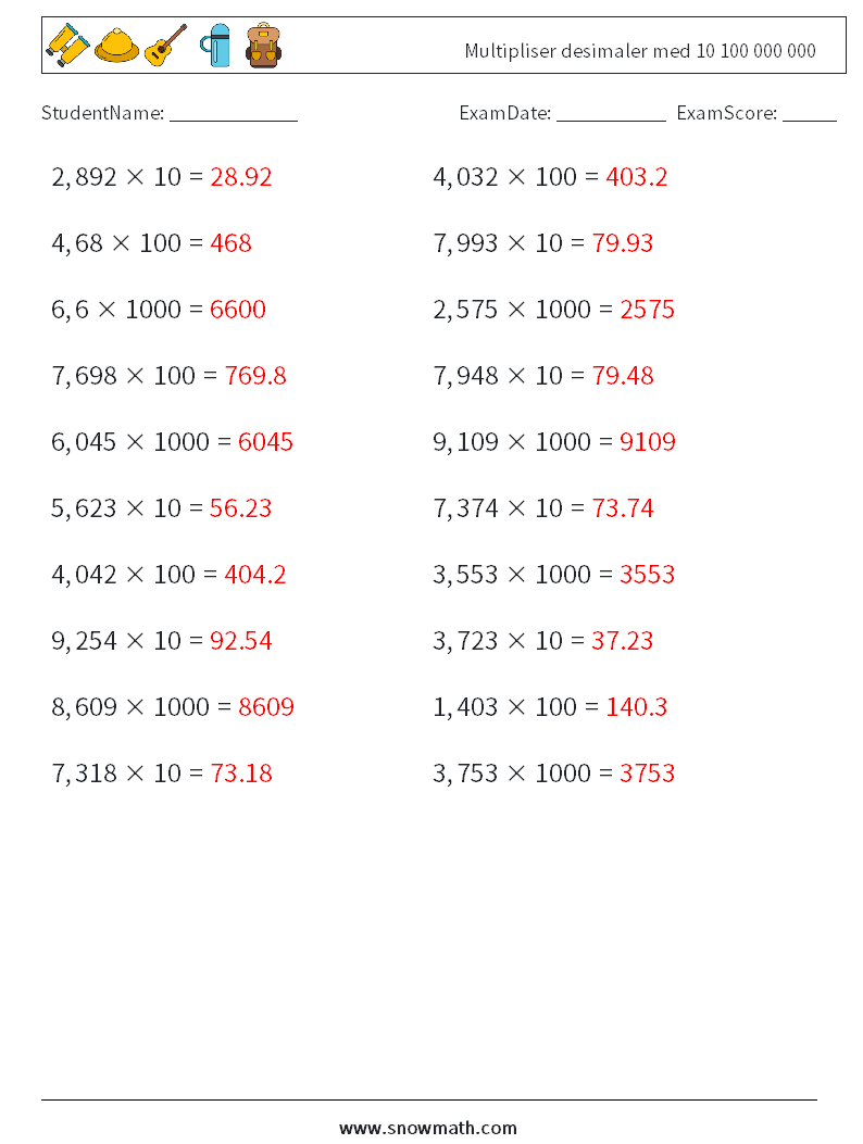 Multipliser desimaler med 10 100 000 000
