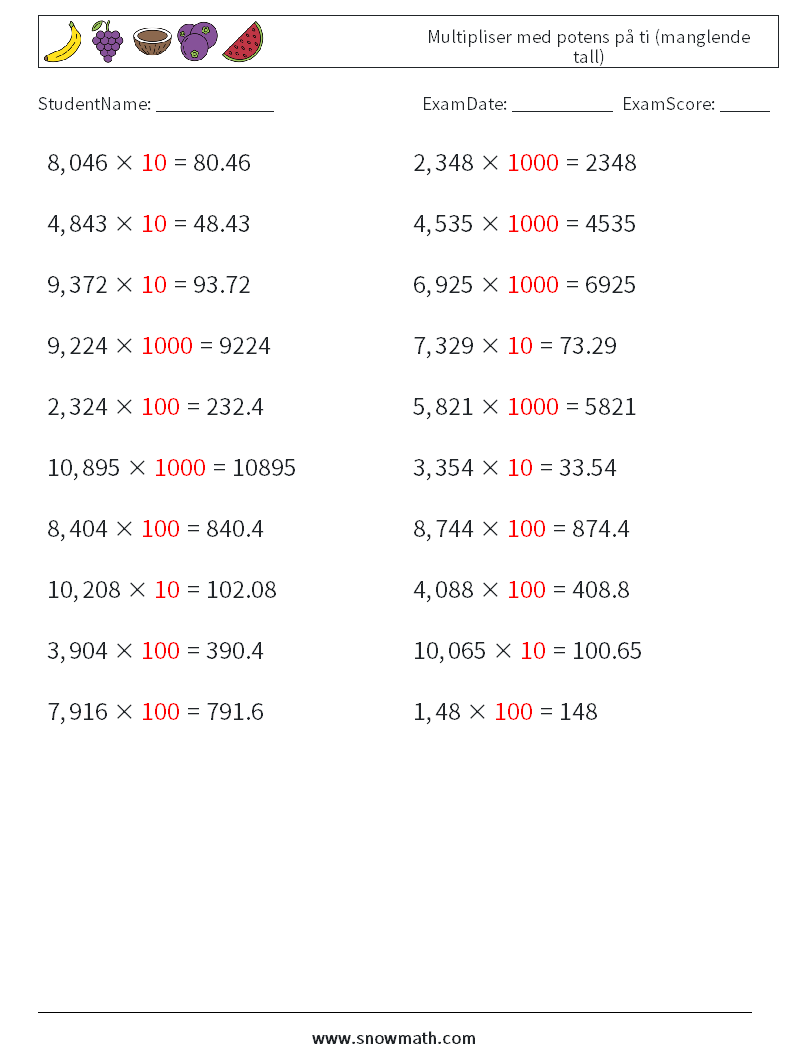 Multipliser med potens på ti (manglende tall)