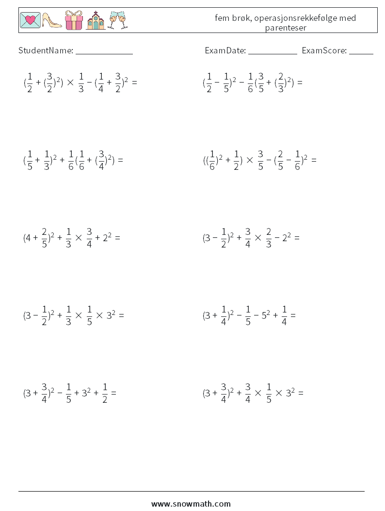 (10) fem brøk, operasjonsrekkefølge med parenteser MathWorksheets 5