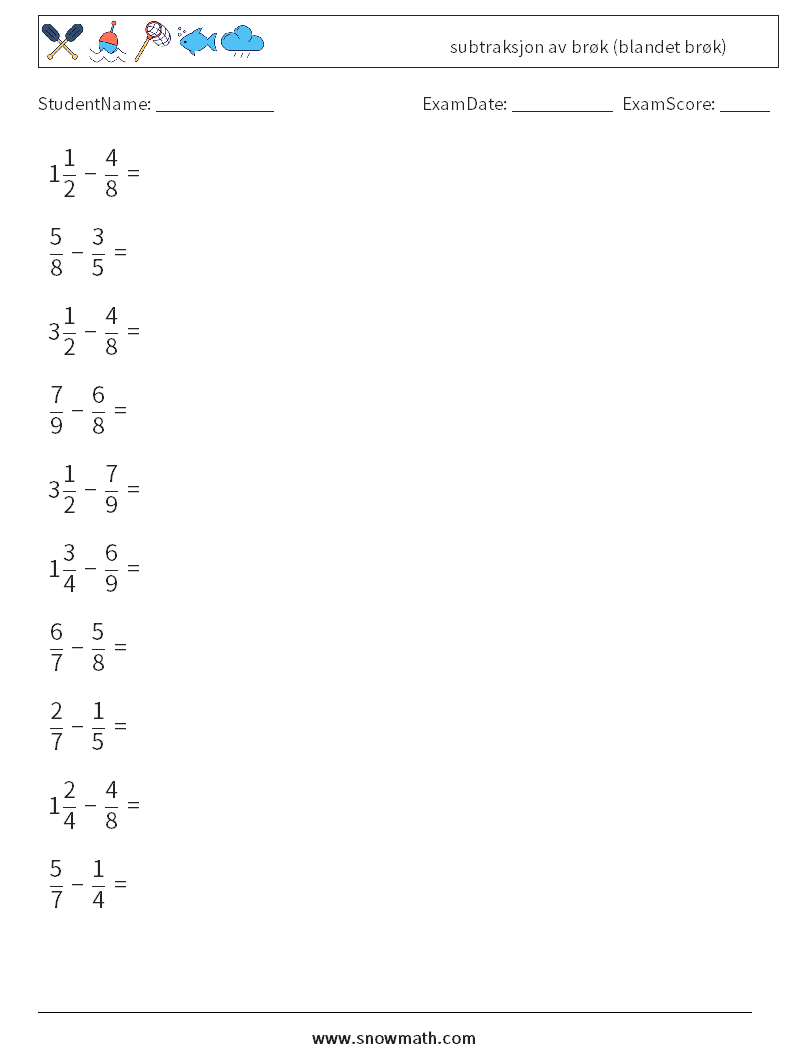 (10) subtraksjon av brøk (blandet brøk) MathWorksheets 10