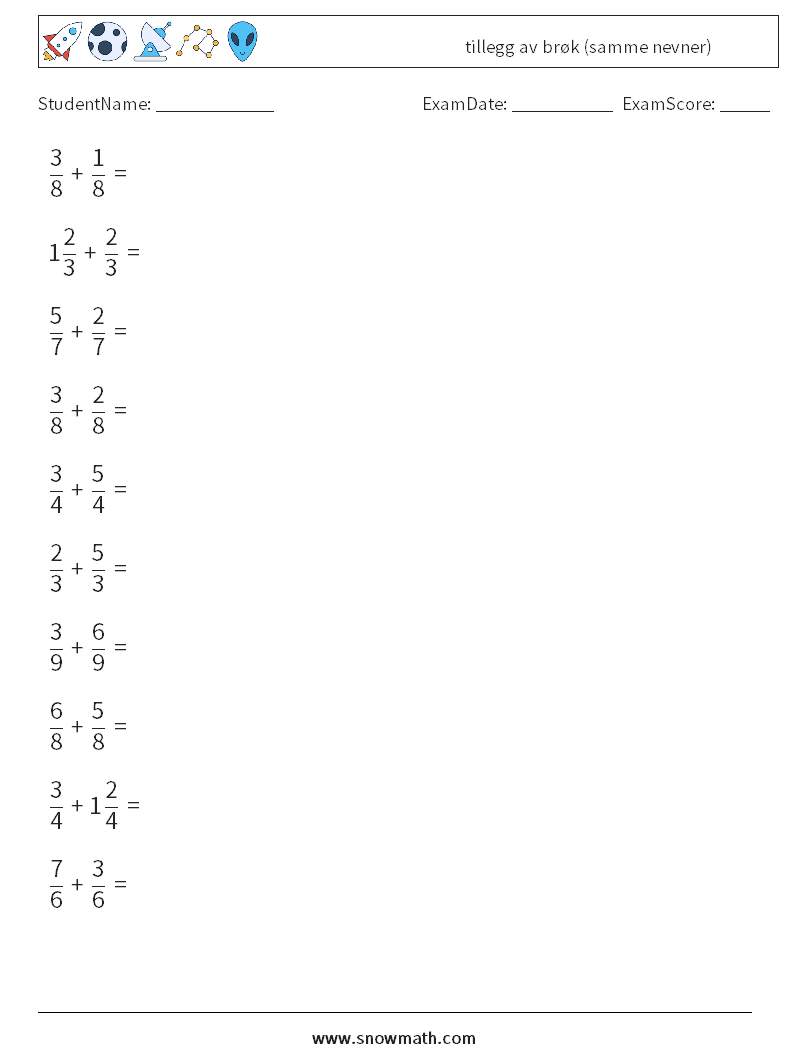 (10) tillegg av brøk (samme nevner) MathWorksheets 7
