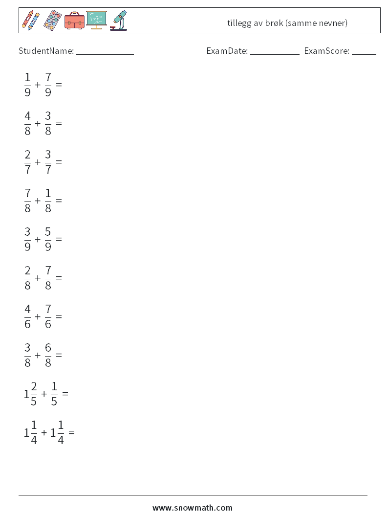 (10) tillegg av brøk (samme nevner) MathWorksheets 9
