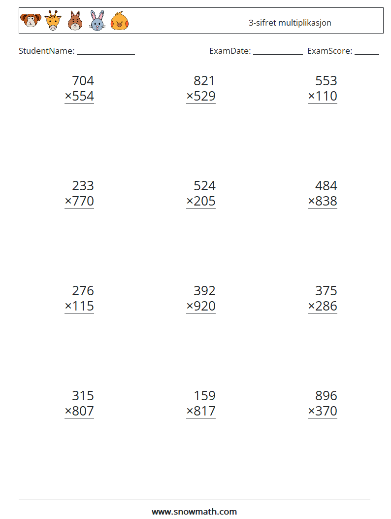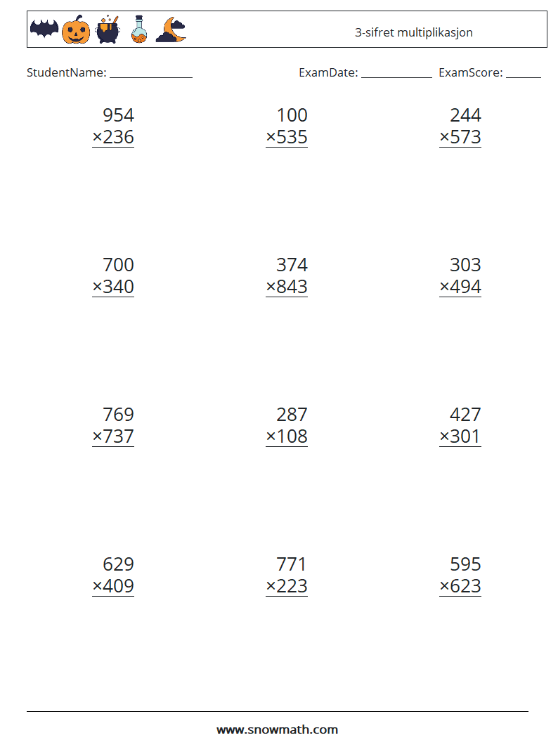 (12 matematiske spørsmål) Øv regneark med 3-sifret multiplikasjon.