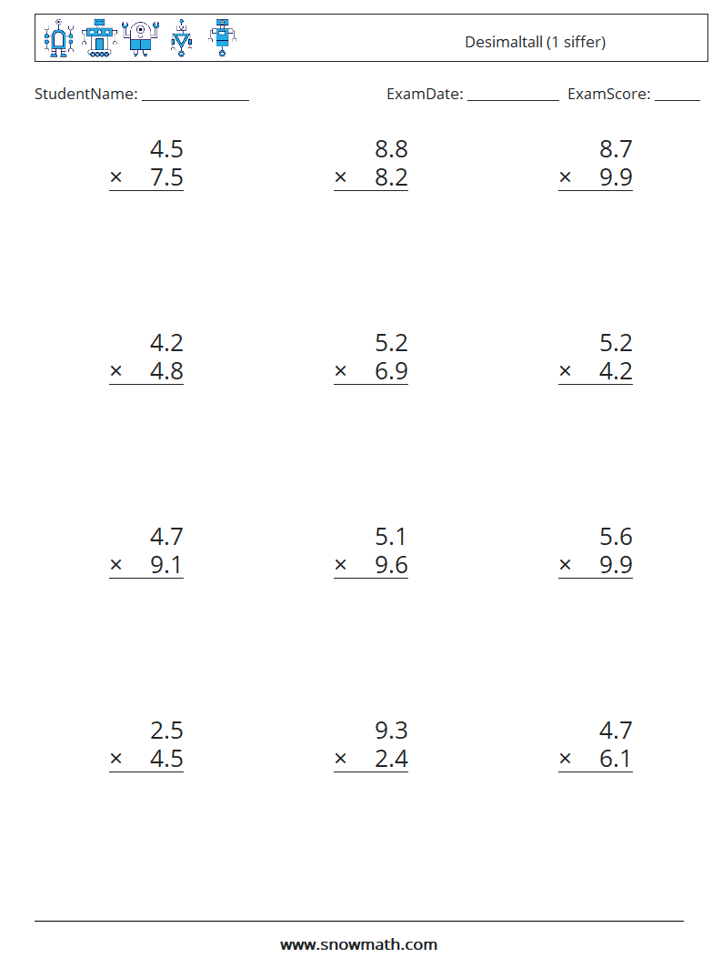 (12) Desimaltall (1 siffer) MathWorksheets 12