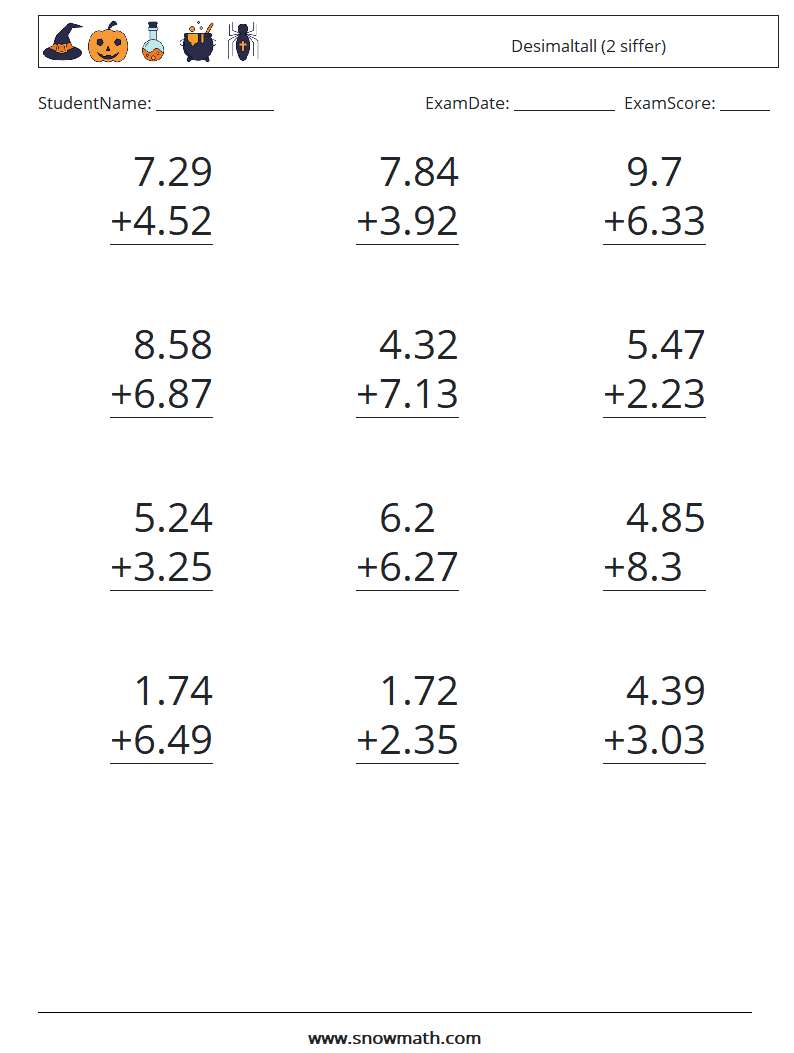(12) Desimaltall (2 siffer) MathWorksheets 9