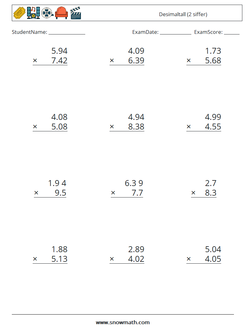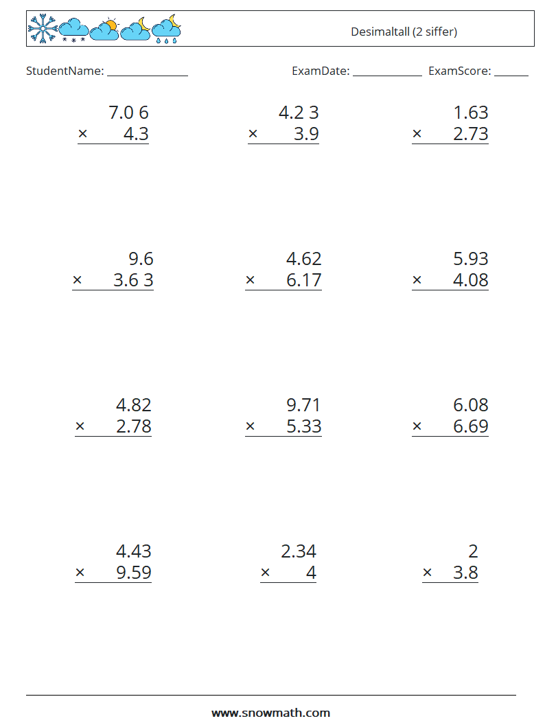 (12) Desimaltall (2 siffer) MathWorksheets 2