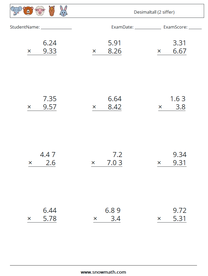 (12) Desimaltall (2 siffer) MathWorksheets 12