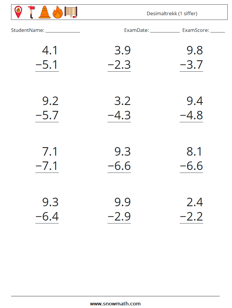 (12) Desimaltrekk (1 siffer) MathWorksheets 3