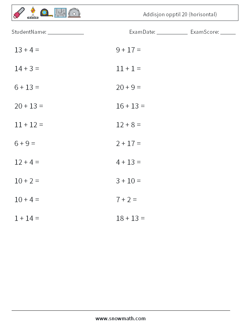 (20 matematiske spørsmål) Øv matematisk tillegg innen 20, skriv ut gratis matematiske regneark.