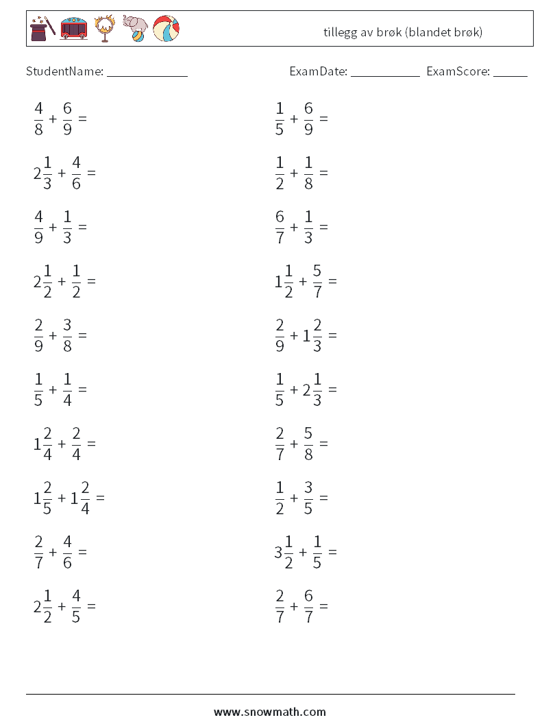 (20) tillegg av brøk (blandet brøk) MathWorksheets 9