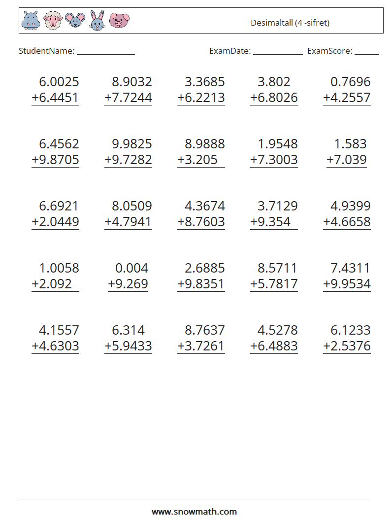 (25) Desimaltall (4 -sifret) MathWorksheets 4