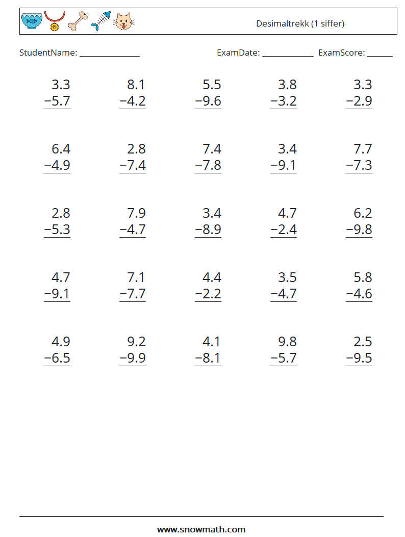 (25) Desimaltrekk (1 siffer) MathWorksheets 7