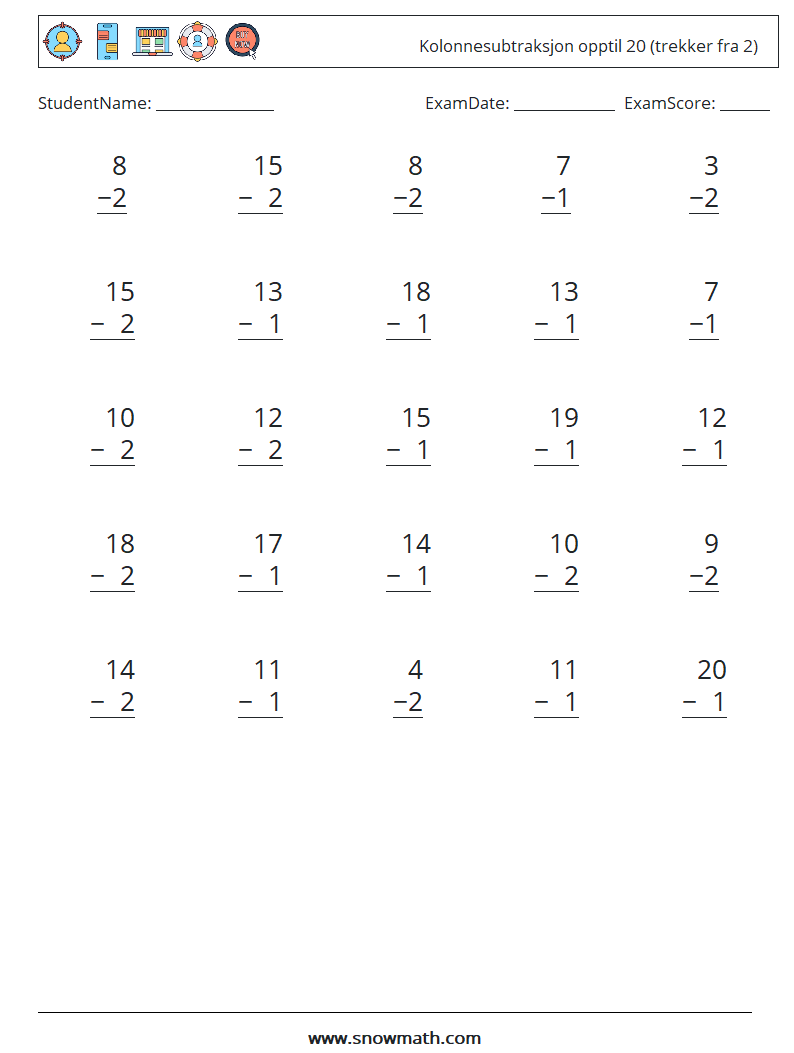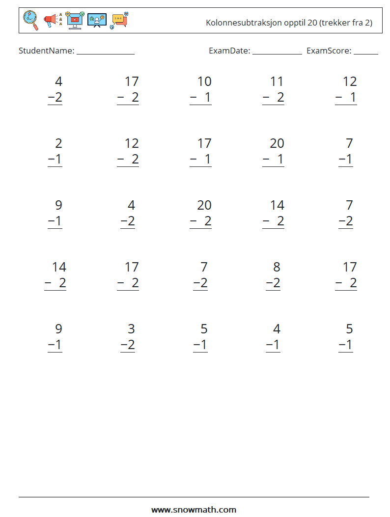 (25 matematiske spørsmål) Subtraksjon innen 20, trekk fra 2, last ned gratis regneark i matematikk.