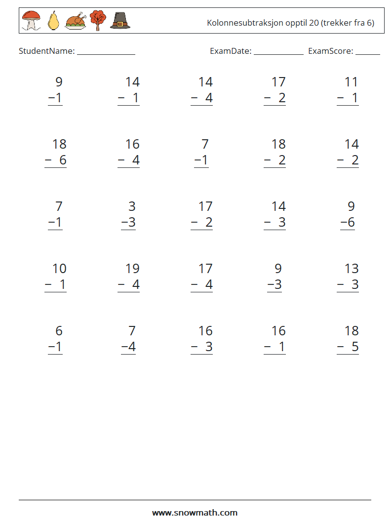 (25) Kolonnesubtraksjon opptil 20 (trekker fra 6) MathWorksheets 14