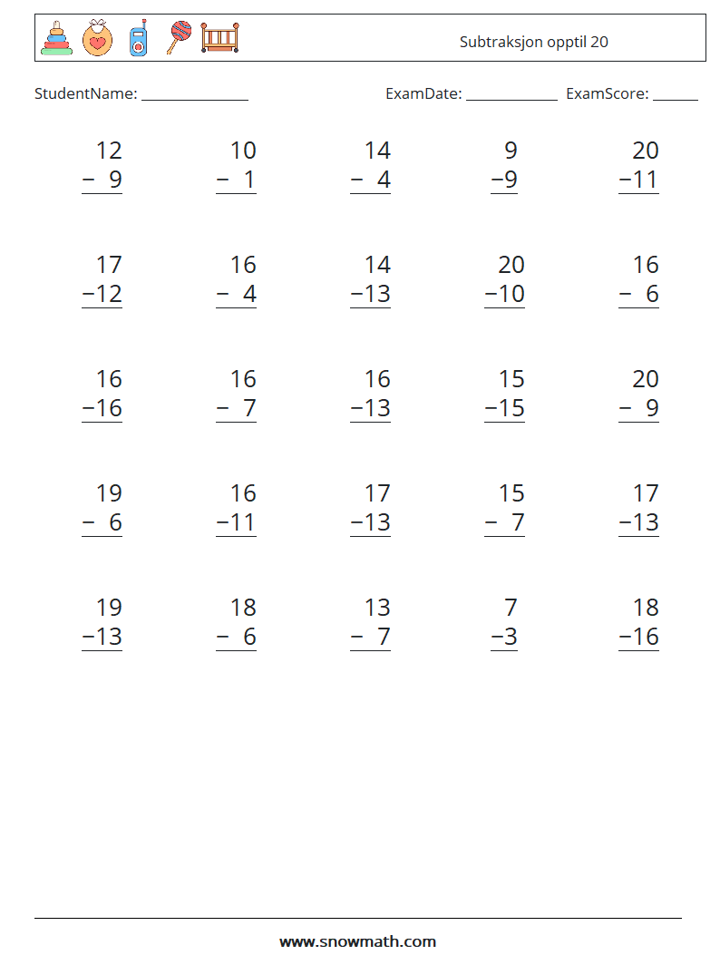 (25) Subtraksjon opptil 20 MathWorksheets 2