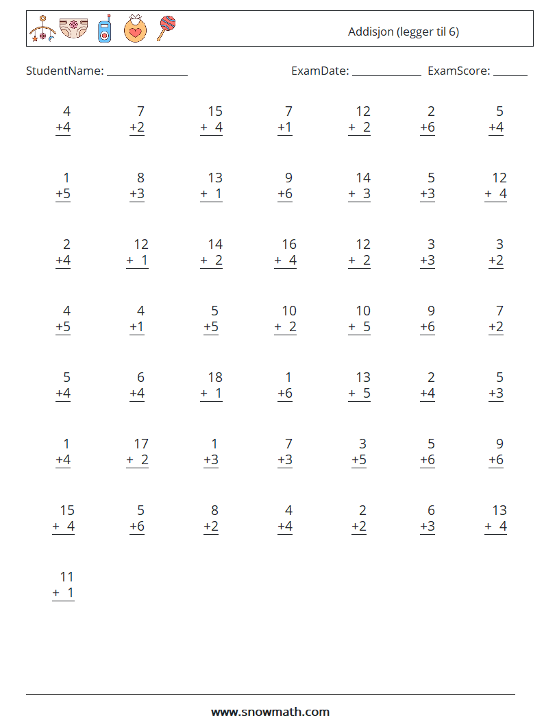 (50) Addisjon (legger til 6) MathWorksheets 11