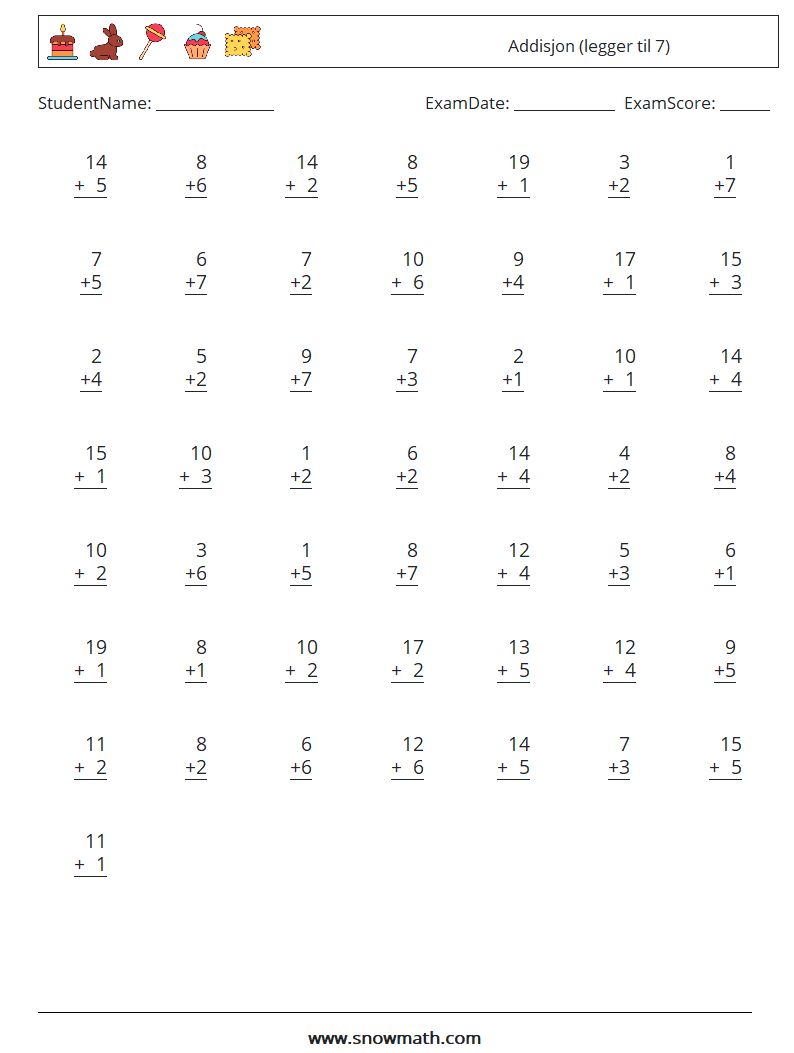 (50) Addisjon (legger til 7) MathWorksheets 2