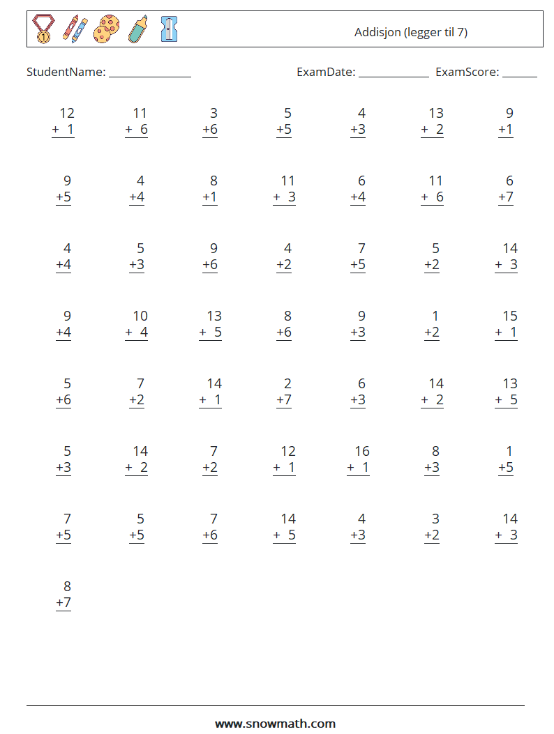 (50) Addisjon (legger til 7) MathWorksheets 8