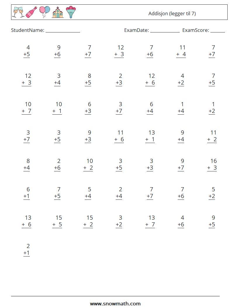 (50) Addisjon (legger til 7) MathWorksheets 12