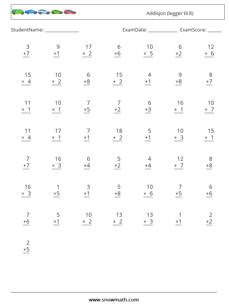 (50) Addisjon (legger til 8) MathWorksheets 2