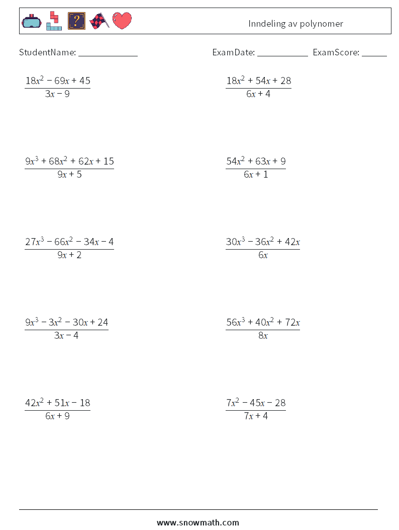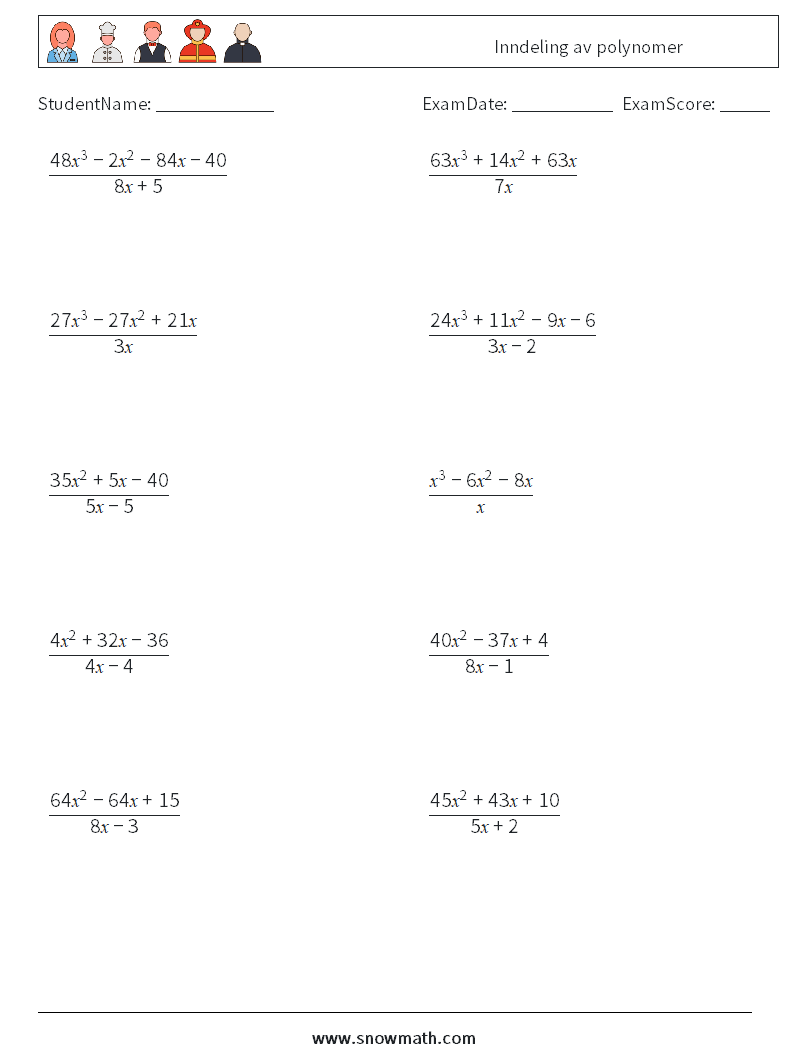 Inndeling av polynomer, matematikk fra videregående skole, gratis regneark for matte.