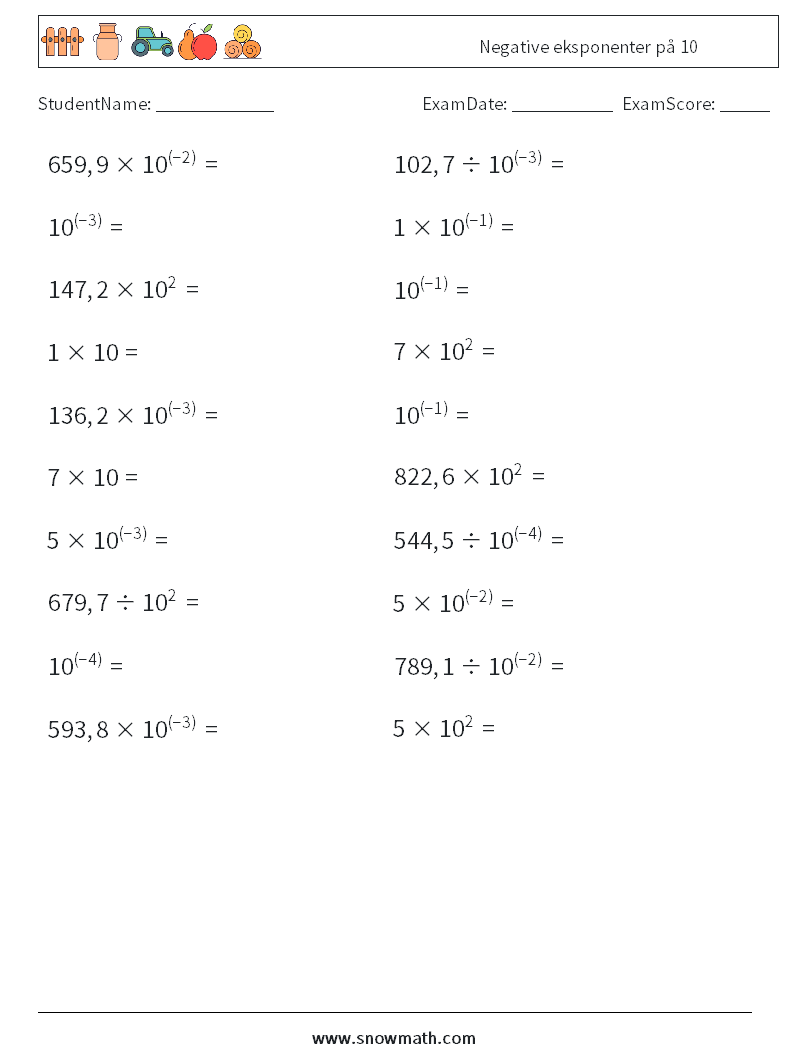 Negative eksponenter på 10 (effekt på 10), gratis regneark i matematikk.