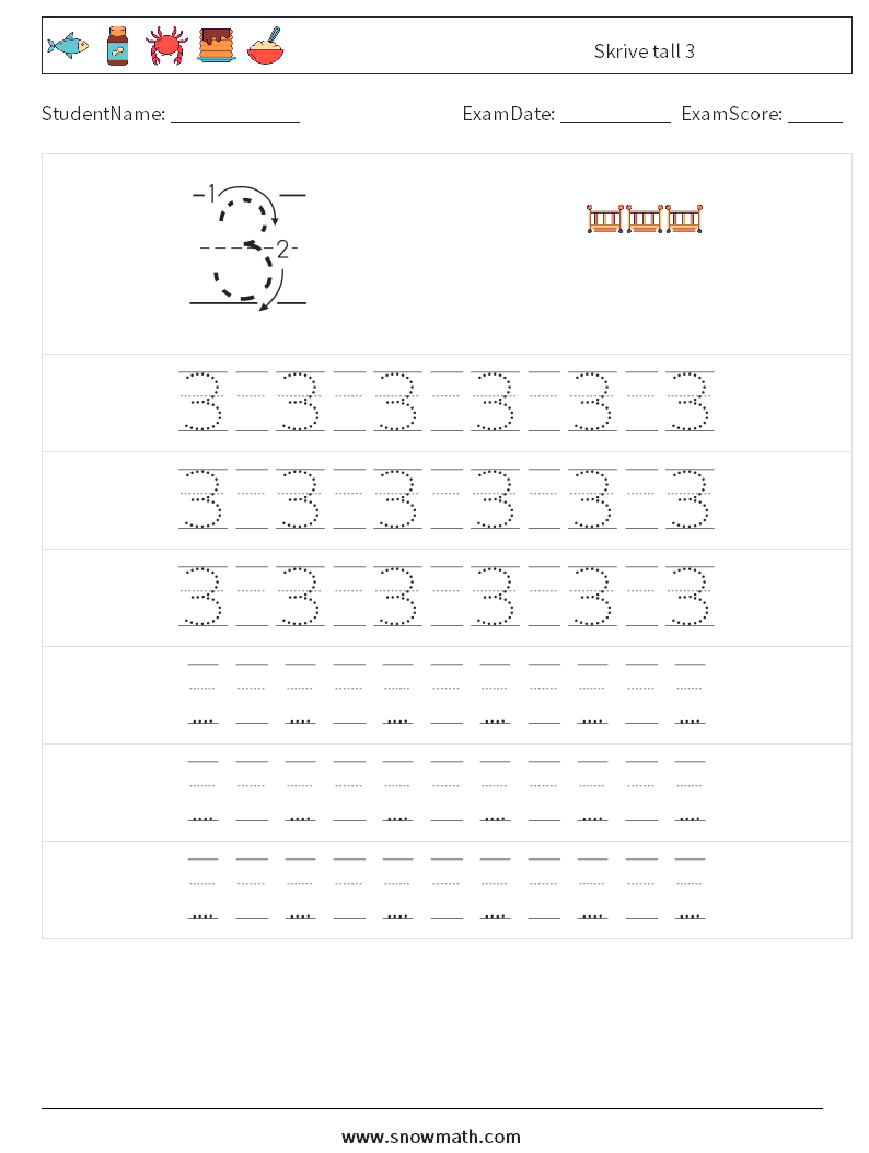 Lær hvordan du skriver nummer 3, utskrivbare matematiske regneark