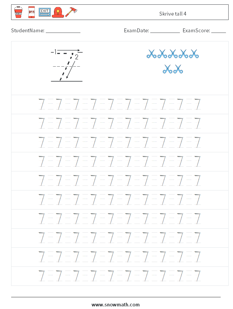 Lær hvordan du skriver nummer 7, utskrivbare regneark
