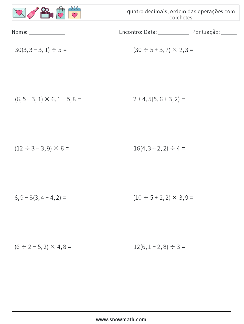(10) quatro decimais, ordem das operações com colchetes planilhas matemáticas 12