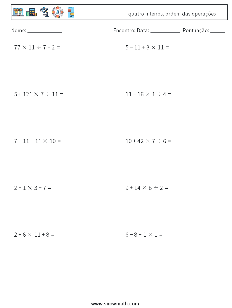 (10) quatro inteiros, ordem das operações planilhas matemáticas 9