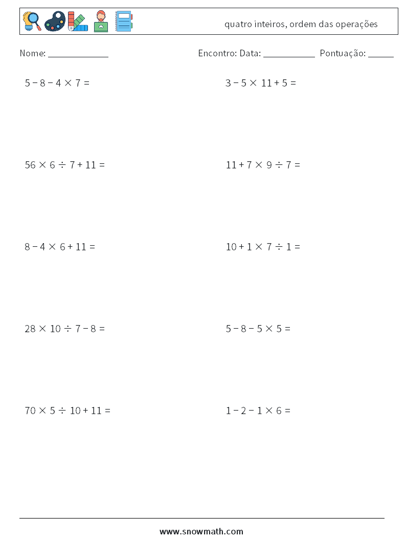 (10) quatro inteiros, ordem das operações planilhas matemáticas 4