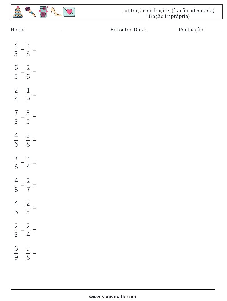 (10) subtração de frações (fração adequada) (fração imprópria) planilhas matemáticas 10