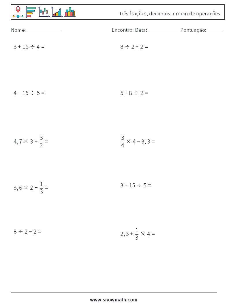 (10) três frações, decimais, ordem de operações planilhas matemáticas 10