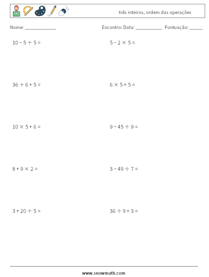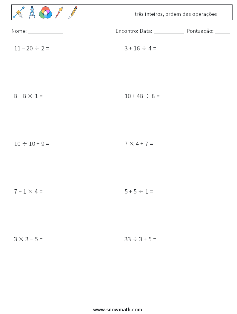 (10) três inteiros, ordem das operações planilhas matemáticas 10