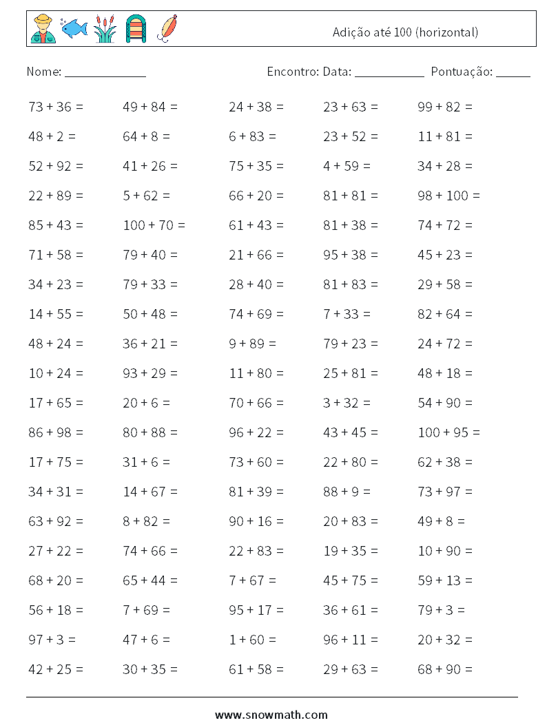 (100) Adição até 100 (horizontal) planilhas matemáticas 8