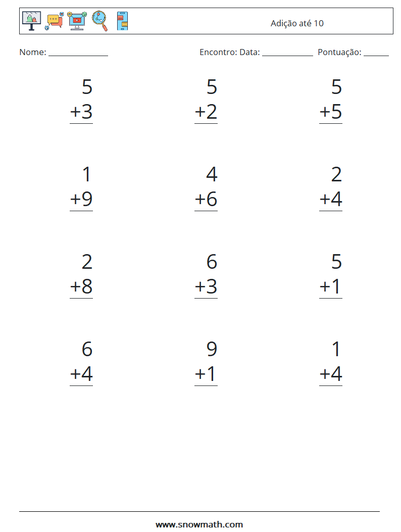 (12 questões de matemática) Aprenda Adição até 10, imprima planilhas de matemática gratuitas.