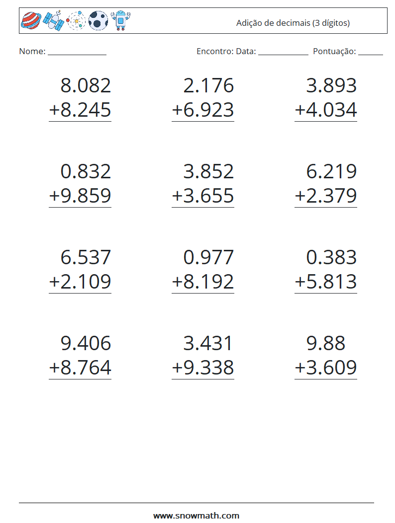 (12) Adição de decimais (3 dígitos) planilhas matemáticas 8