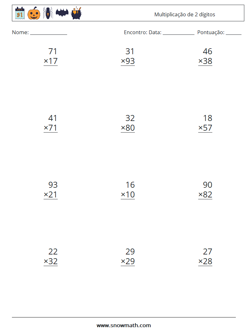 (12) Multiplicação de 2 dígitos planilhas matemáticas 1