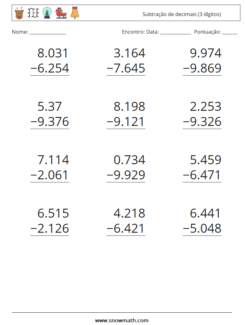 (12) Subtração de decimais (3 dígitos) planilhas matemáticas 12