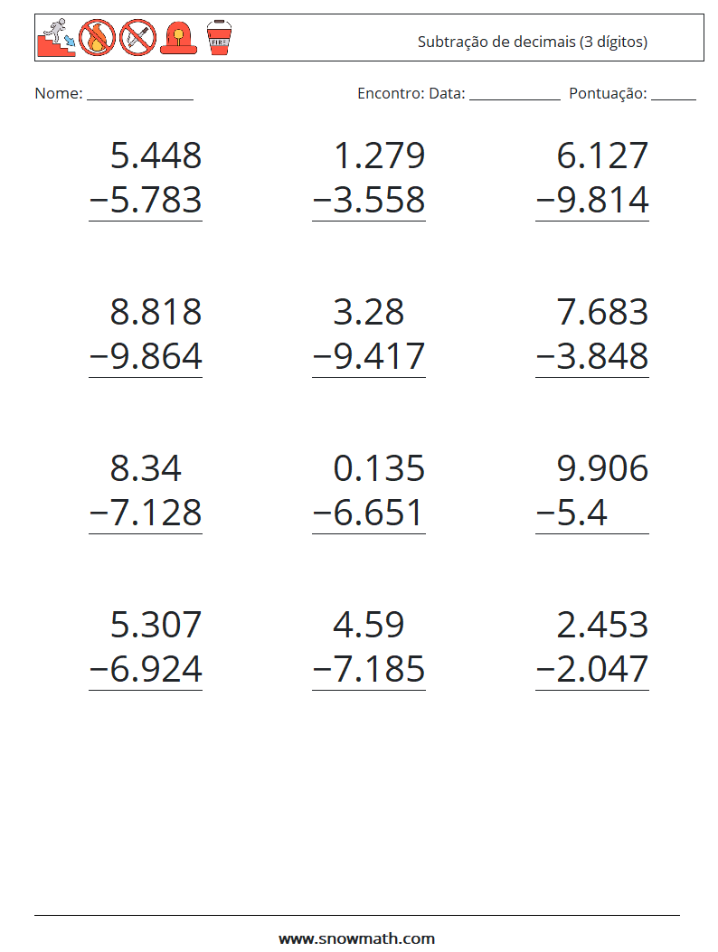 (12) Subtração de decimais (3 dígitos) planilhas matemáticas 10