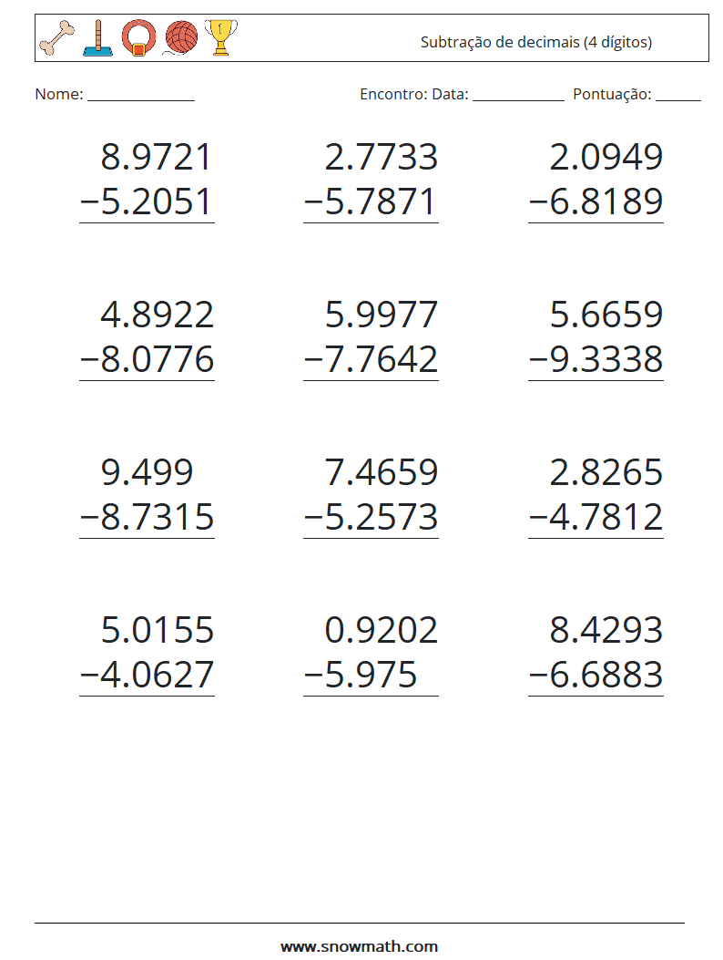 (12) Subtração de decimais (4 dígitos) planilhas matemáticas 10