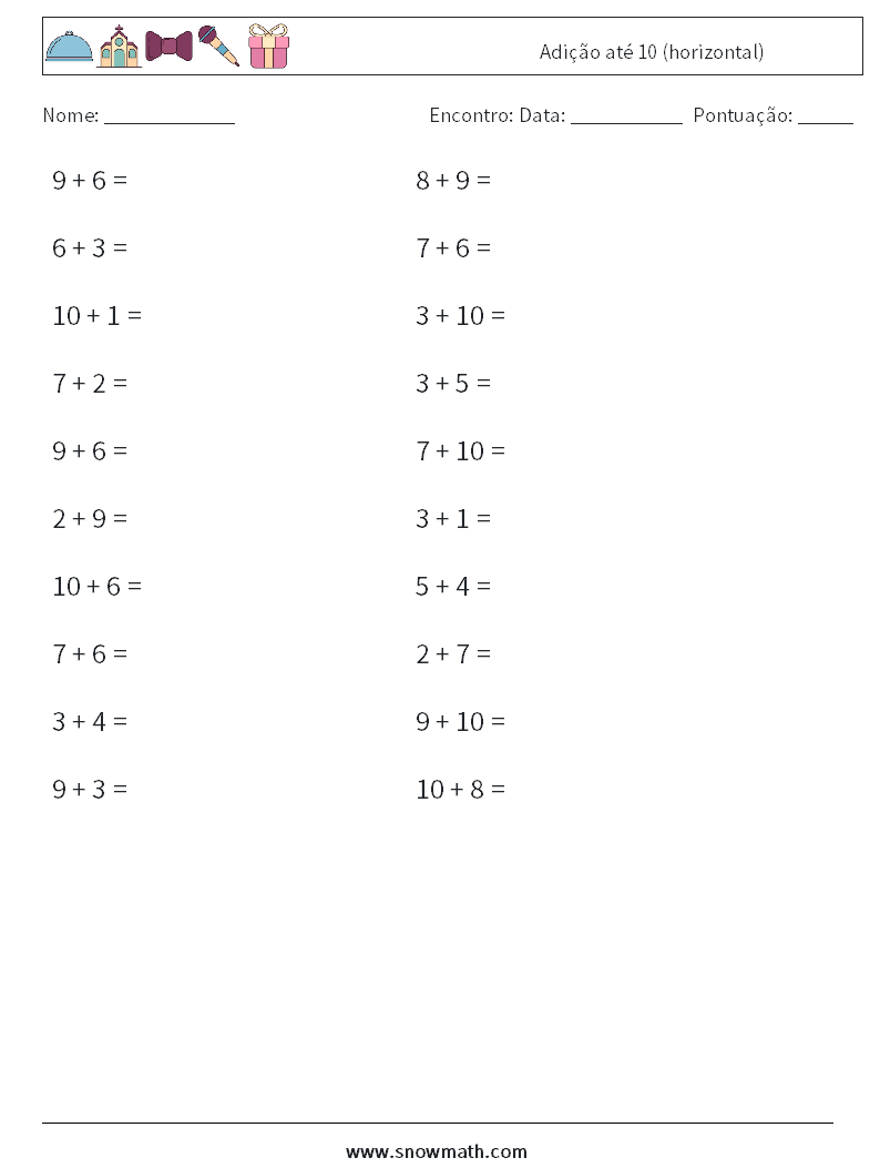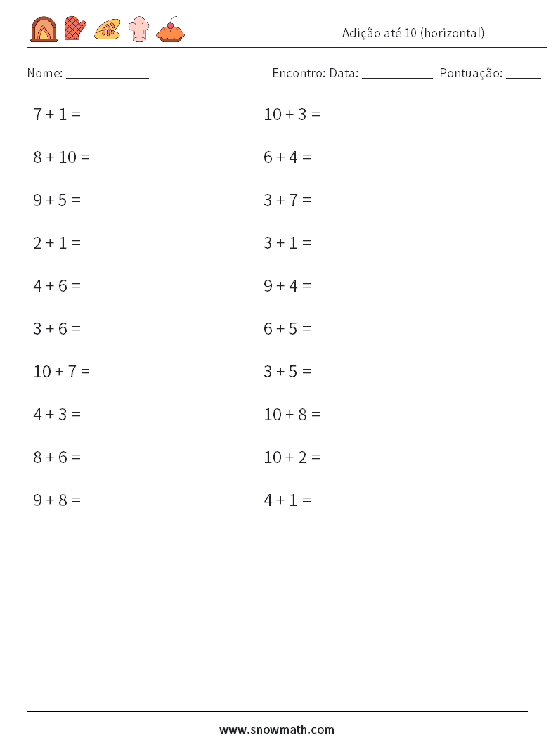 (20) Adição até 10 (horizontal) planilhas matemáticas 3