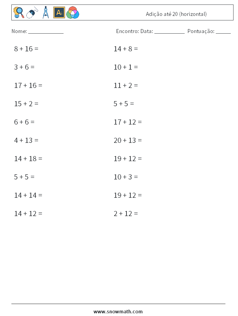 (20 questões de matemática) Pratique a adição de matemática em até 20, imprima planilhas de matemática gratuitas.