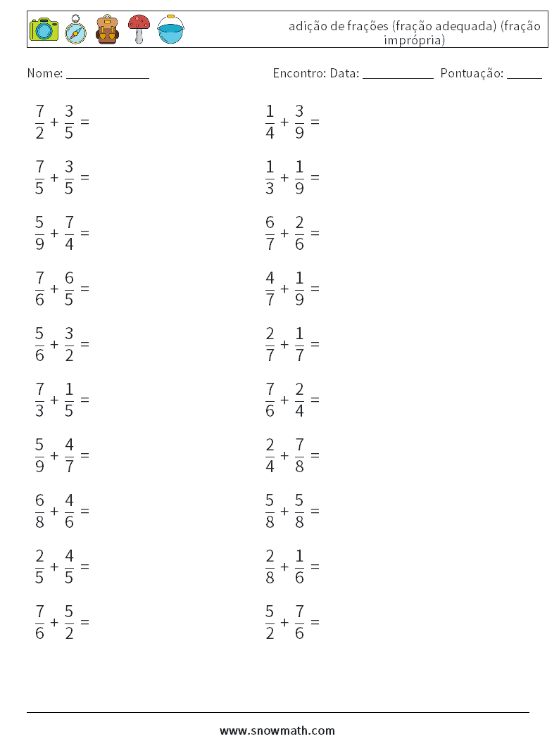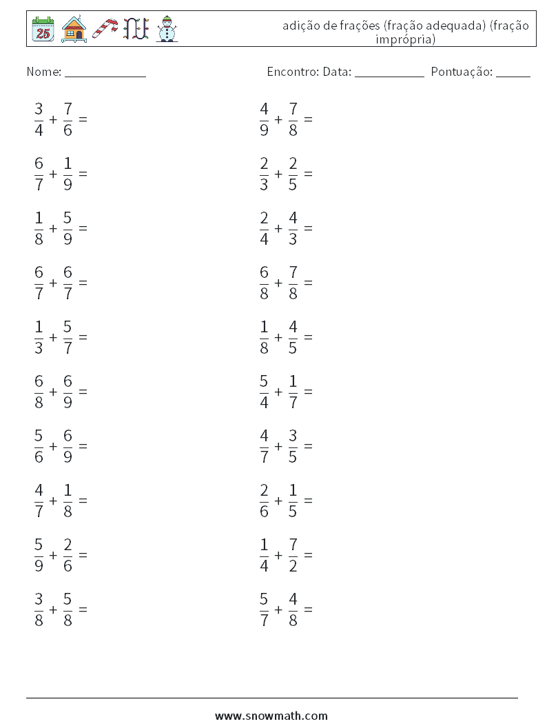 (20) adição de frações (fração adequada) (fração imprópria) planilhas matemáticas 12