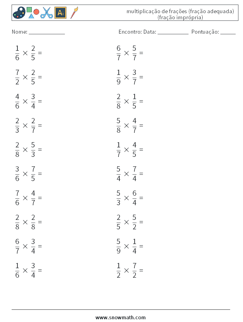 (20) multiplicação de frações (fração adequada) (fração imprópria) planilhas matemáticas 12