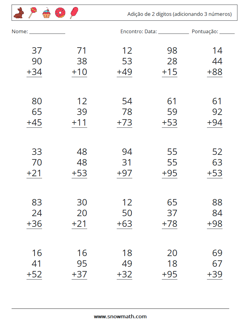 (25 questões de matemática) Aprenda adição, adicionando três números de 2 dígitos, planilhas de matemática para impressão.