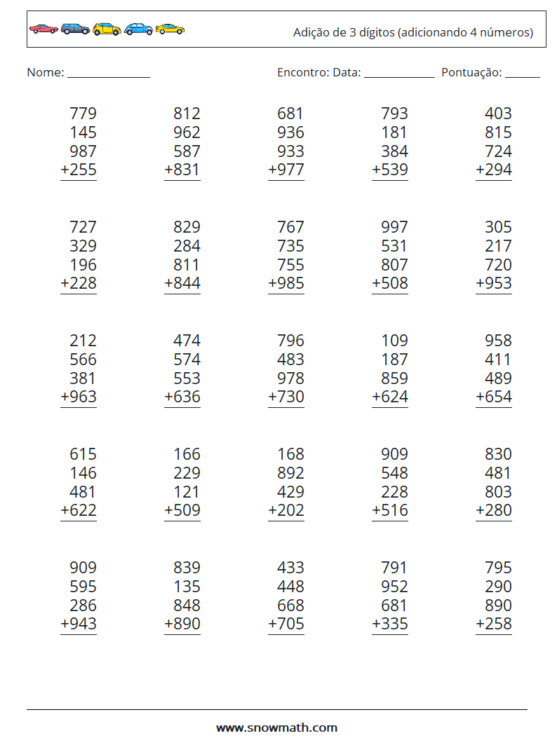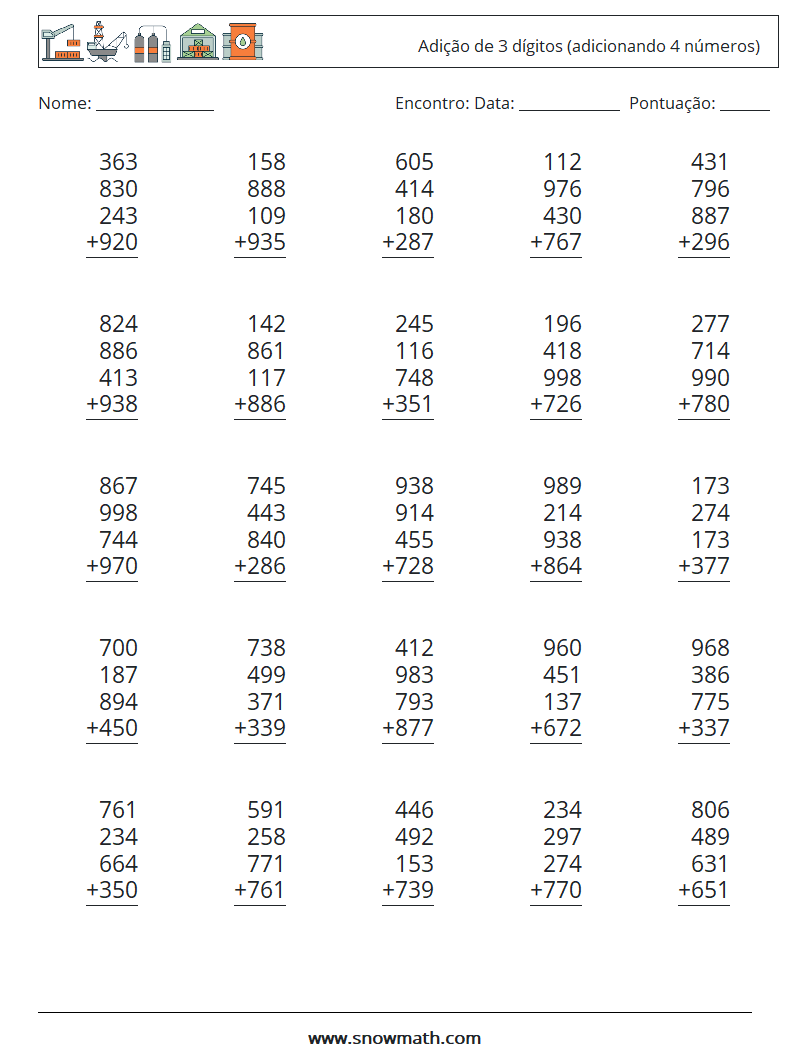 (25) Adição de 3 dígitos (adicionando 4 números) planilhas matemáticas 12