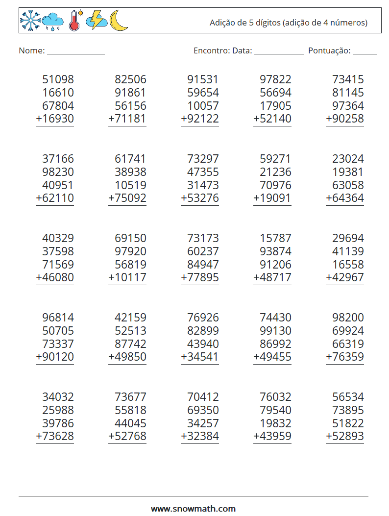 (25) Adição de 5 dígitos (adição de 4 números) planilhas matemáticas 1