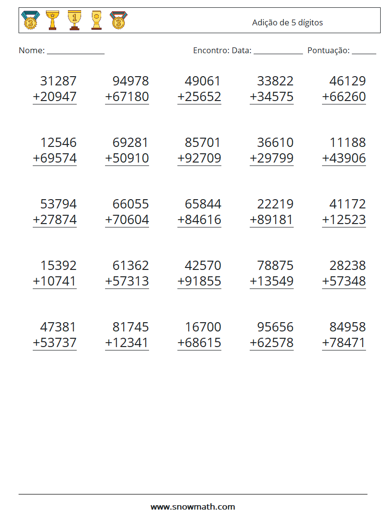 (25 questões matemáticas) Aprenda adição, adicionando números de 5 dígitos, planilhas de matemática para impressão.