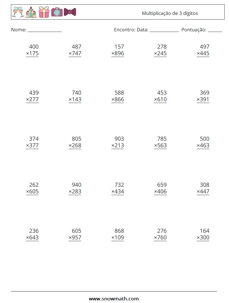 (25 questões matemáticas) Pratique planilhas de multiplicação de 3 dígitos.